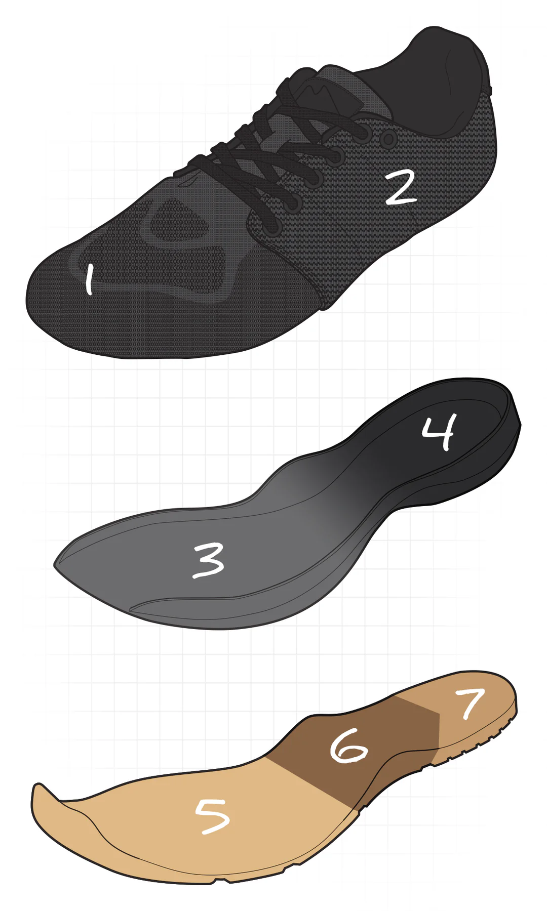 앞발 부분은 통기성이 뛰어나고 유연하며, 중족부에서 발뒤꿈치까지는 견고하고 안정적입니다.